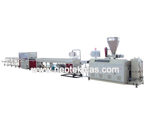 生產線由錐形雙螺桿擠出機、真空定徑箱,牽引切割機、堆放架組成,配以不同規(guī)格模具,生產4出16-32電工穿線管材,大大提高了生產效率。