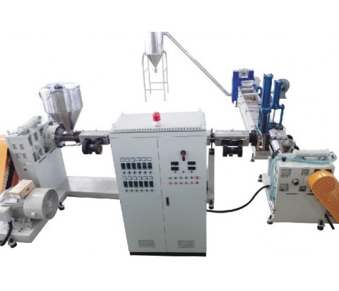 由兩臺(tái)單螺桿擠出機(jī)、液壓換網(wǎng)器、拉條造粒模具、水槽冷卻裝置、吹干裝置、切粒裝置、風(fēng)送儲(chǔ)存系統(tǒng)組成。