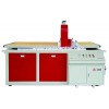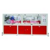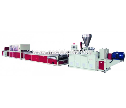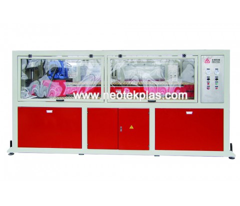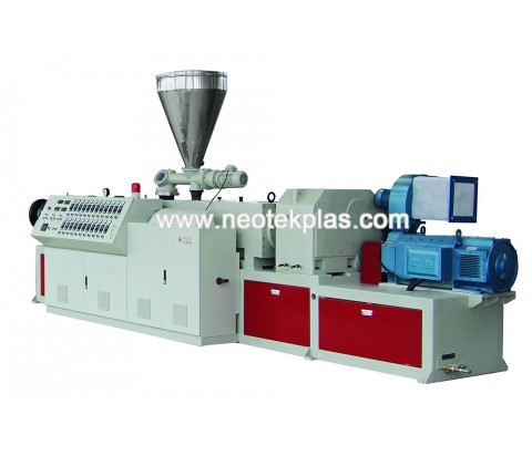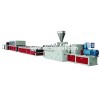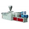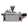 生產(chǎn)線采用SJZ錐形雙螺桿擠出機(jī),輔機(jī)由真空定徑臺(tái)、牽引機(jī)、切割機(jī)及推料架組成。
