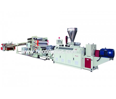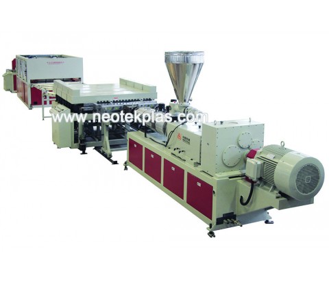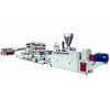 PVC自由發(fā)泡、PVC木塑板材生產(chǎn)線、PVC次結(jié)皮發(fā)泡板生產(chǎn)線由雙螺桿擠出機、板材模具、真空定型和十輥牽引等等輔機部分組成。